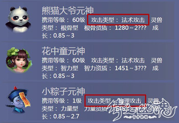 灵兽分为4种,分别是物理攻击,法术攻击,物理肉宠,法术肉宠。这个宠物里有标注,不多说。